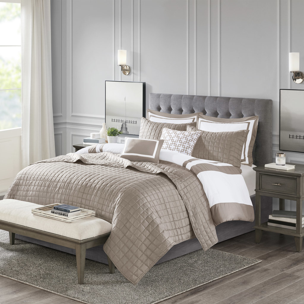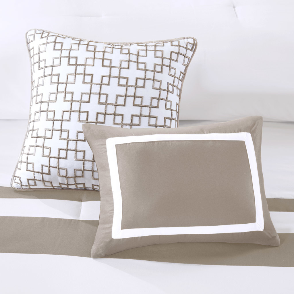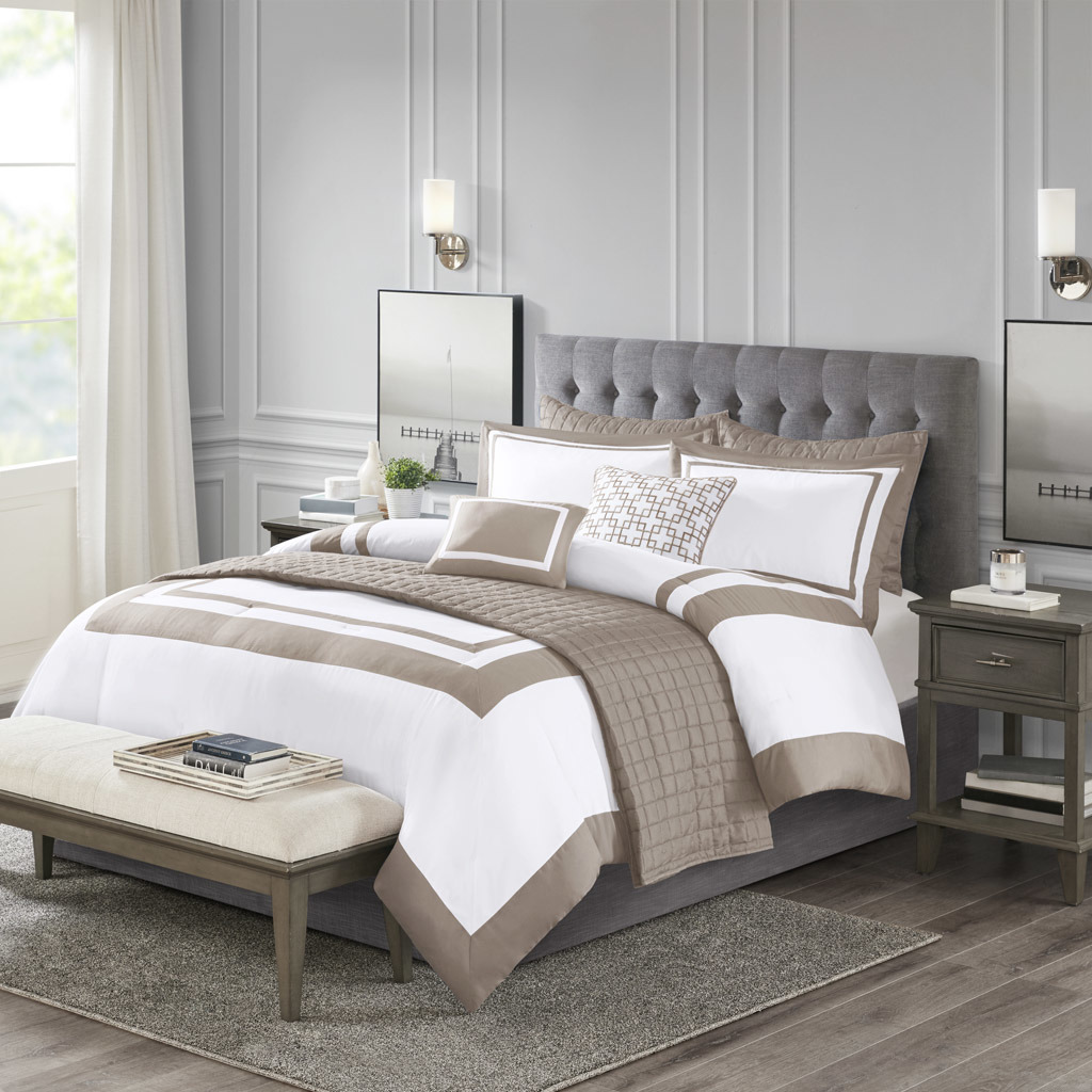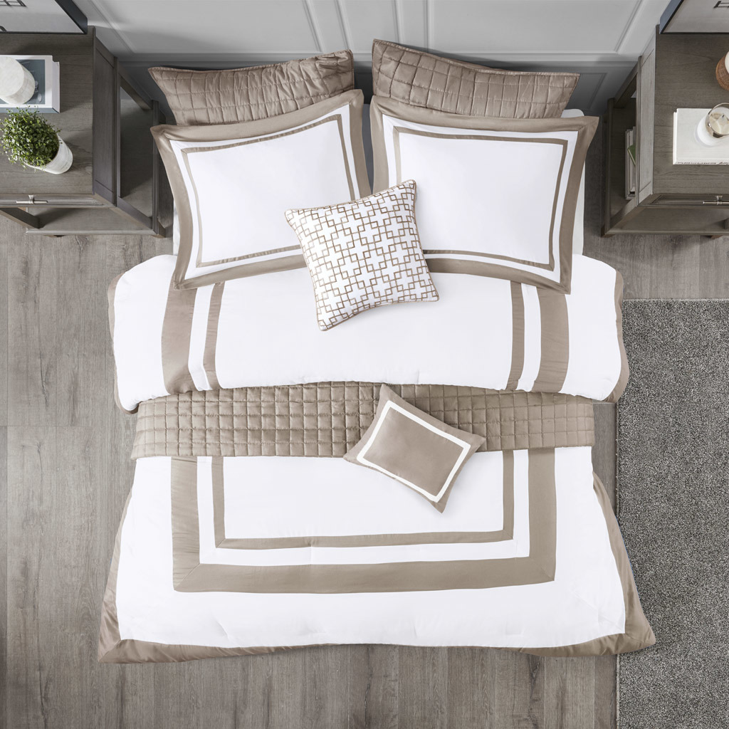 This Heritage hotel bedding collection includes a comforter and quilt that both come with matching shams to complete a luxurious layered look. The soft comforter and shams showcase a bold border on a white ground with a solid white reverse, while the lightweight quilt and its shams display a window pane end-to-end quilting pattern. Two decorative pillows, one square and one oblong with embroidered and pieced details provide the perfect finishing touches to this 8 piece bedding set. This set is available in grey, navy, and taupe options. Machine washable for easy care, this collection is great for year-round use.