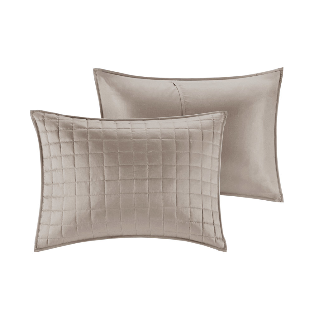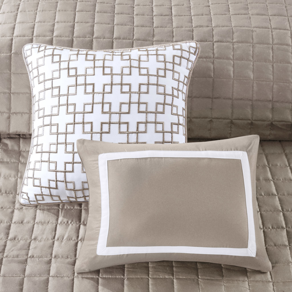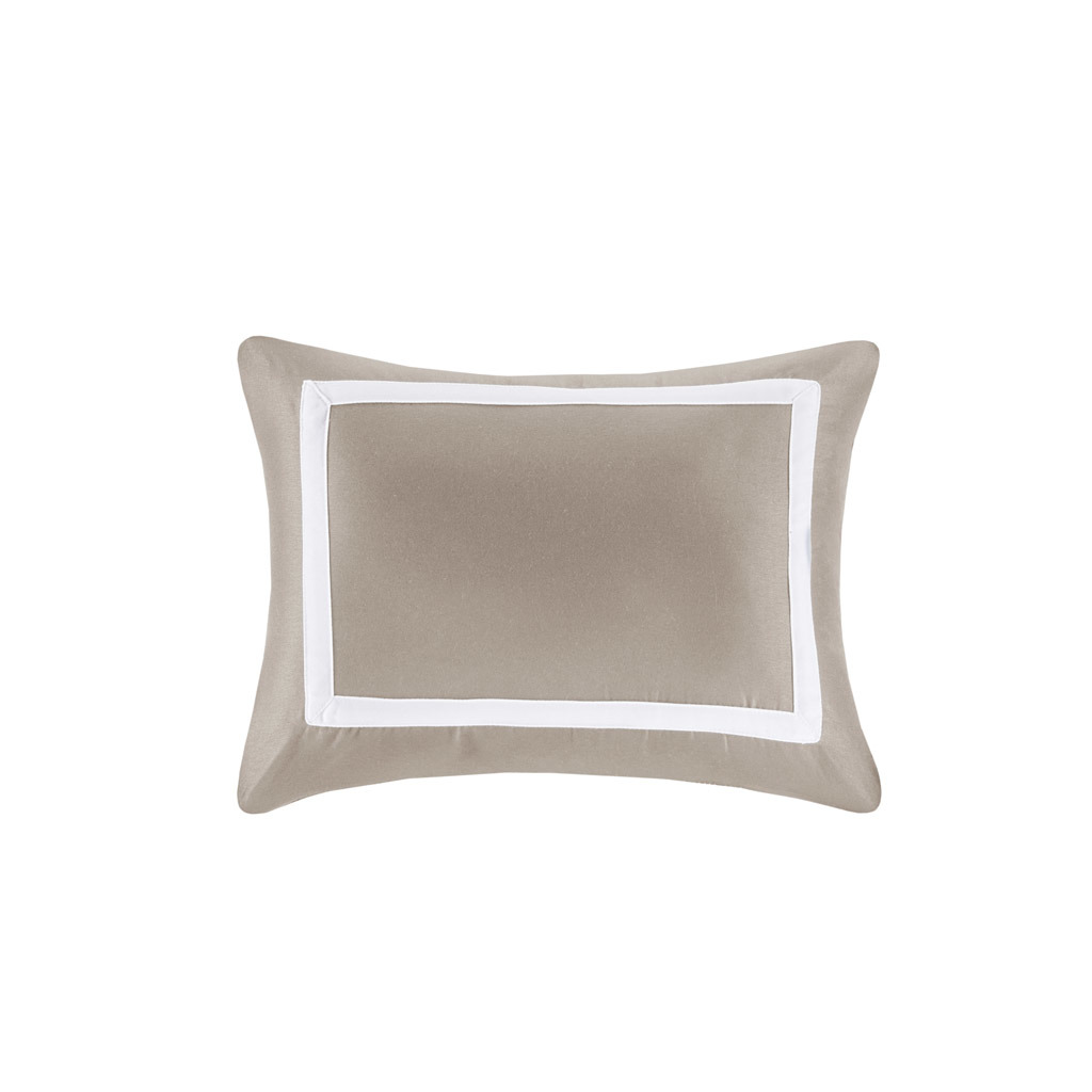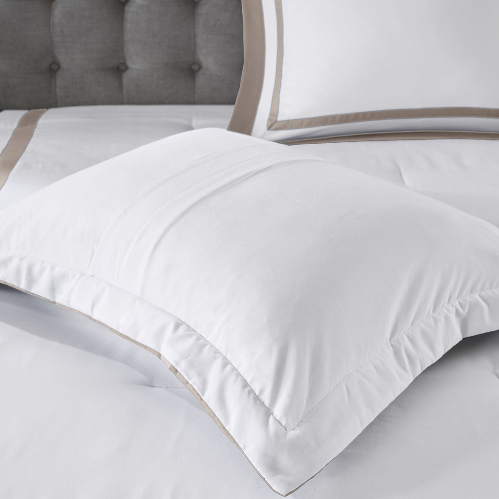 This Heritage hotel bedding collection includes a comforter and quilt that both come with matching shams to complete a luxurious layered look. The soft comforter and shams showcase a bold border on a white ground with a solid white reverse, while the lightweight quilt and its shams display a window pane end-to-end quilting pattern. Two decorative pillows, one square and one oblong with embroidered and pieced details provide the perfect finishing touches to this 8 piece bedding set. This set is available in grey, navy, and taupe options. Machine washable for easy care, this collection is great for year-round use.
