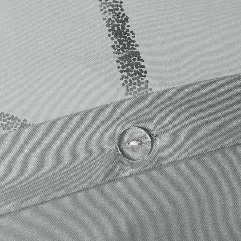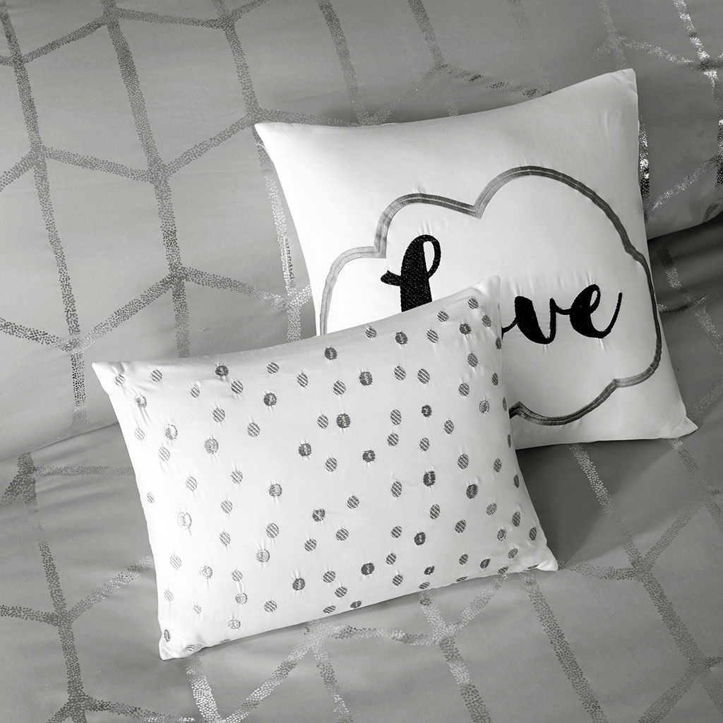 Freshen up your bedroom with the enchanting style of Intelligent Design's Raina Printed Duvet Cover Set. The stunning duvet cover flaunts a geometric, metallic silver print against a soft grey ground for a fun and eye-catching look! Matching sham(s) echo the design seen on top of bed and pulls the entire ensemble together. Two embroidered decorative pillows with typography and metallic details complete this fabulous duvet cover set. This bedding set uses an antimicrobial treatment that provides built-in freshness protection, reducing the growth of odor causing bacteria to keep fabric lasting longer. Button closures allow you to place a comforter insert within the duvet cover and internal corner ties prevent it from shifting.
